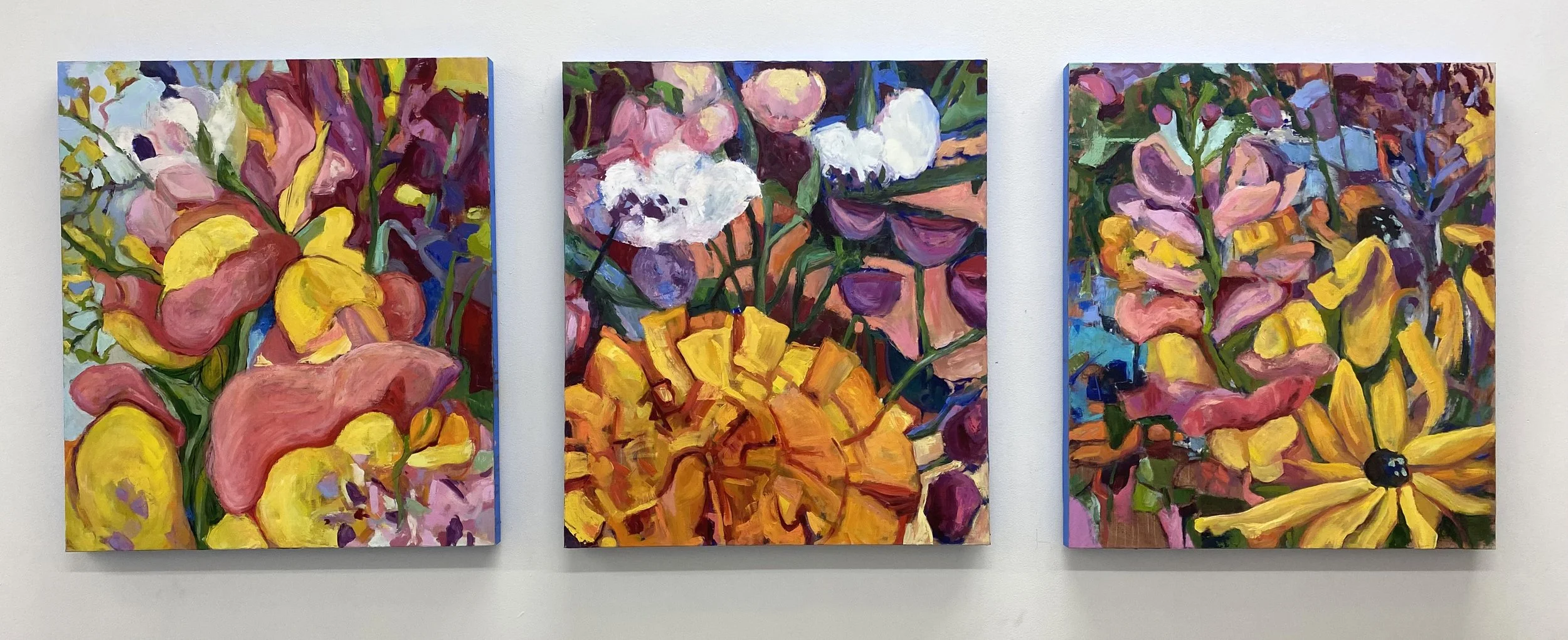 TRIPTYCH: Flowers from the Fair, Raucous bunch, Finding Balance. 2025. Oil on linen, 32x88”/81.3x223.5 cm